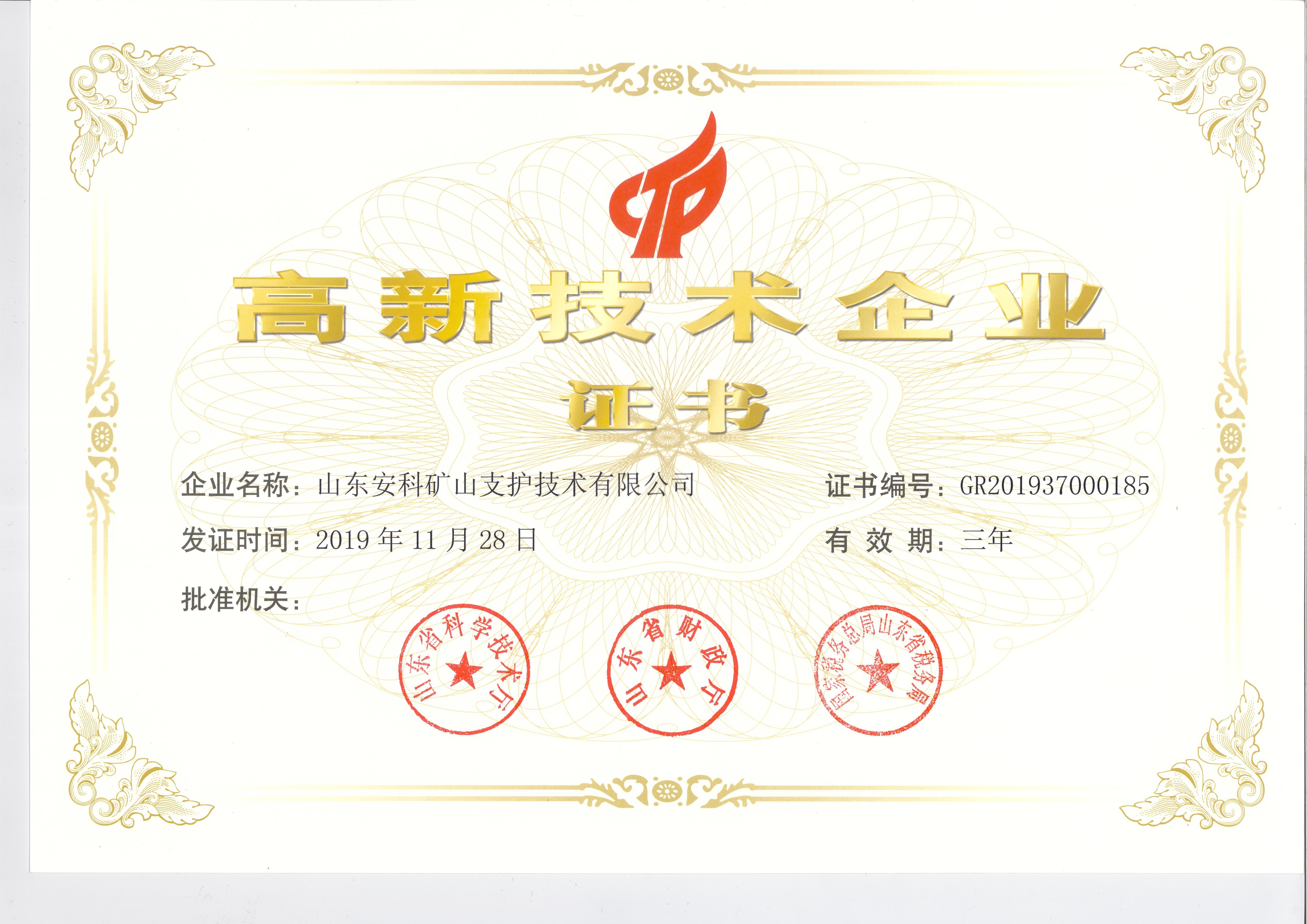 山东安科矿山支护技术有限公司荣获由山东省科学技术厅、山东省财政厅、国家税务总局山东省税务局联合颁发的《高新技术企业证书》,企业技术实力雄厚。